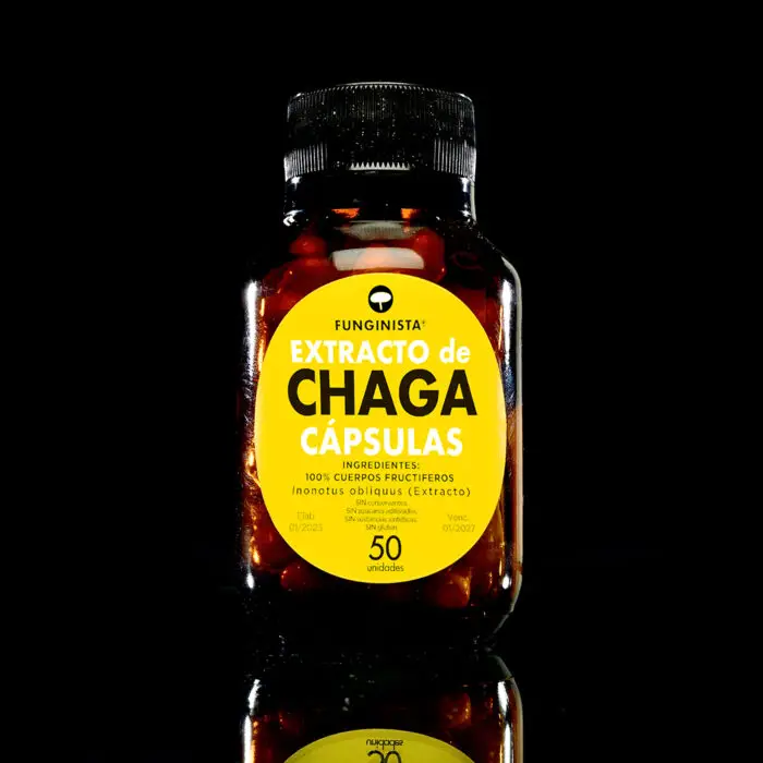 Extracto de Chaga (Inonotus obliquus) de origen siberiano en cápsulas vegetales.